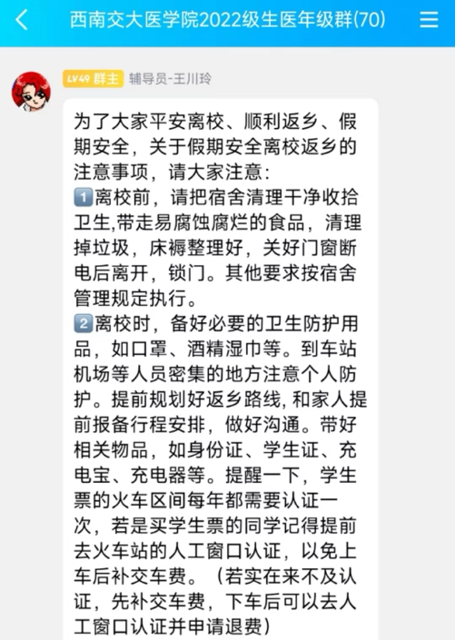 2024年寒假即将来临,辅导员靳涵、王川玲针对不同的年级分别召开安全主题教育。在2023级、2022级的安全教育中,王川玲老师提醒同学们,尤其是大一的同学们,离开宿舍前确认已经关好门窗、关闭电源,最后一位离开的同学要仔细确认,以免发生意外。报名寒假“返家乡”社会实践的同学要注意出行安全,按照学校的要求完成宣讲。在2021级和2020级的安全教育中,靳涵老师强调了实验室安全的重要性。目前很多同学都表示要留在学校做实验,不少同学每天需要往返于犀浦-九里之间,这就要求同学们不仅要注意出行安全,按时上下实验,不长时间在外逗留,更要注意实验室安全,做好自身防护。有些同学利用假期时间外出旅游的一定要告知家长,包括同行人员的联系方式,保持手机畅通,随时报平安。最后,两位老师都叮嘱同学们,要利用好寒假,合理安排时间,多读书、读好书,提升自我修养,度过一个充实、愉快的假期。