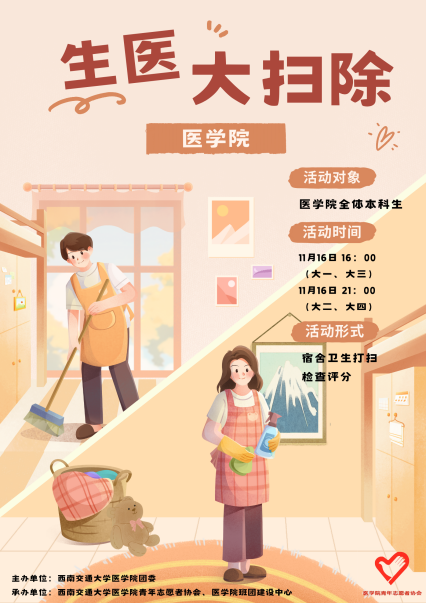 青年志愿者协会详细介绍了打扫寝室的重要意义及相关注意事项。此次寝室大扫除不仅有助于强化同学们的劳动意识,引导大家崇尚劳动,热爱劳动,尊重劳动;更有助于培养同学们的卫生习惯与集体观念,为同学们创造一个更为舒适的学习和生活环境。此外,“生医大扫除”活动将成为色情直播