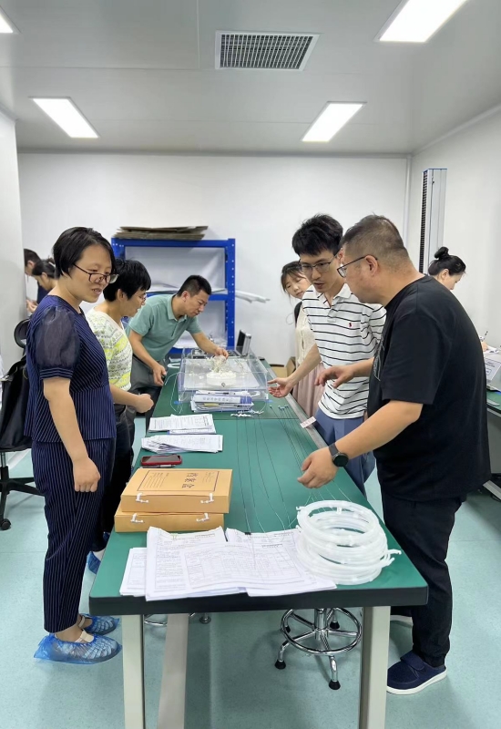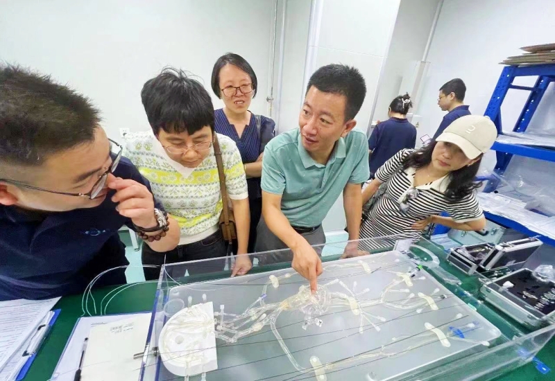 一行现场参观了神经介入、外周介入等相关产品的生产车间、质量检验及产品展厅,听取了公司创始人的介绍,详细了解了医疗器械产品的市场及临床需求。