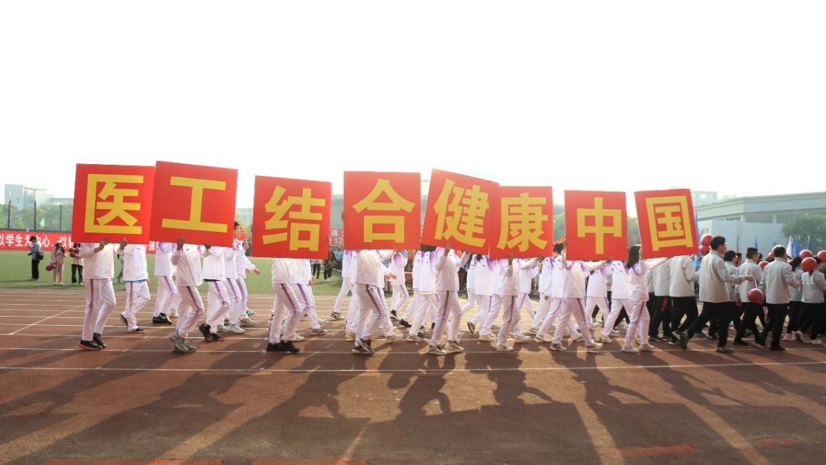 和附属医院方针,高举三面旗帜、迈着坚定整齐的步伐步入赛场,“临床生医,开拓创新,医工结合,健康中国”,铿锵的口号在回响在整个赛场。方阵走在红色的跑道上,更是走在建设具有医工结合特色色情直播