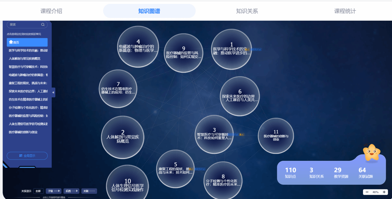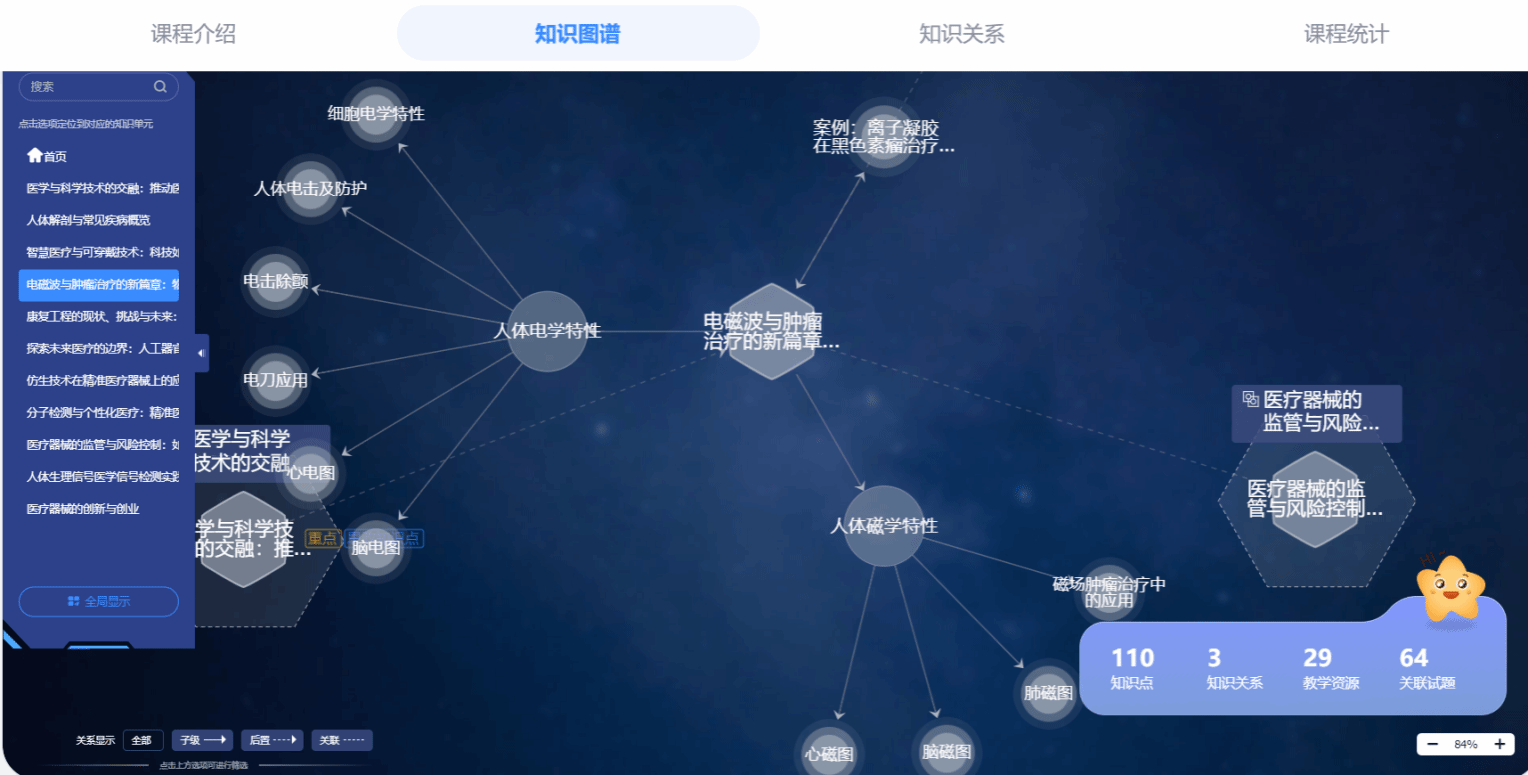 “医疗仪器与人类健康”是课程精心打造的学习平台,包括讲课视频、参考资料、示范案例、知识图谱和AI助教等资源,并通过精心的组织与设计,形成了结构化的课程网站,构建了以学生为中心的多元化学习环境。课程网站为以学生为主体开展毕业设计工作提供了全方位的指导和帮助,更好达成通识教育目标。