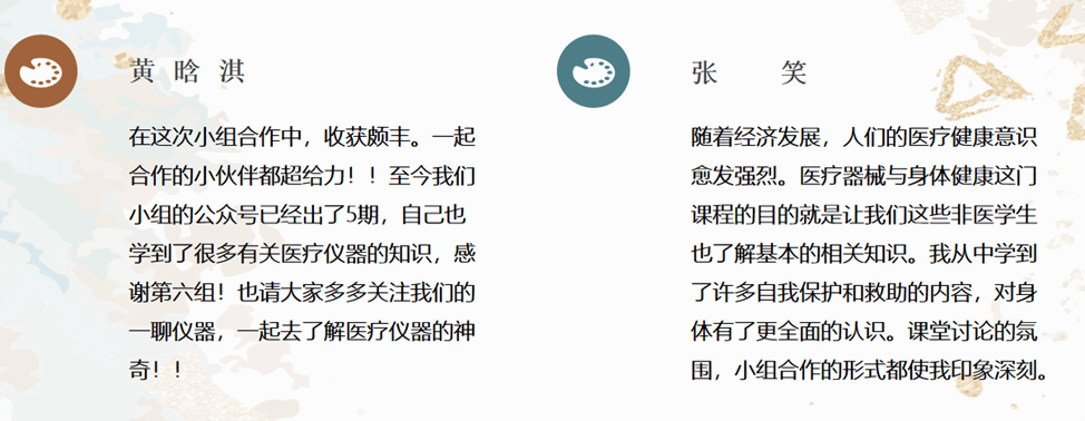 学生课程评价:在此次实践中,作为小组长,我锻炼了组织能力、决策能力,作为文案整理员,在整理文案的同时也认识了不少医疗器械,增加了我的知识面。非常感谢小组成员的积极参与,让我认识了优秀的他们。通过学习这门课,我发现其实医疗器械涉及的面很广,将其他领域的知识和医学知识相结合起来,就可能会有新的发现或可以制造出新的医疗器械。知识是相互交融的,我们受益匪浅。