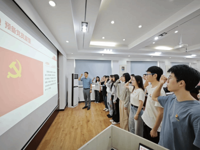 随后,在李锦红书记宣读了批复后,全体参会人员面对鲜红的党旗高举右拳,庄严宣誓。在铿锵有力的誓词声中,党员同志们更加坚定了入党初心和奋斗使命。接着,李锦红书记对新入党党员表示热烈祝贺和欢迎,并对全体学生党员提出了四点希望:一是坚守政治立场,坚定马克思主义信仰和中国特色社会主义信念,树立对民族复兴的信心。二是严明规矩,恪守纪律,维护党的团结统一和党纪的严肃性。三是注重道德修养,提升品行,树立道德标杆。四是勇于奉献,积极作为,发挥先锋模范作用,为党和人民事业贡献力量。