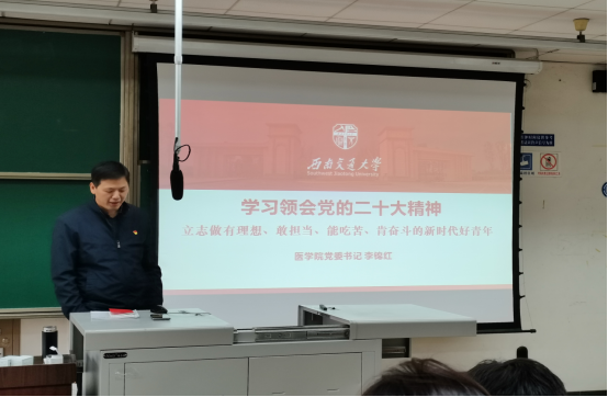 宣誓仪式结束后,李锦红书记为同志们讲授了专题党课《学习领会党的二十大精神立志做有理想、敢担当、能吃苦、肯奋斗的新时代好青年》。李锦红书记首先与同学们就学习领会党的二十大精神对自己的启发进行了充分交流,随后从以下四个方面向同学们进行讲述:一是为什么要认真学习领会党的二十大精神,二是如何学习领会党的二十大精神,三是结合实际,学习领会党的二十大精神,四是学习宣传贯彻党的二十大精神,作为党员的职责和使命。