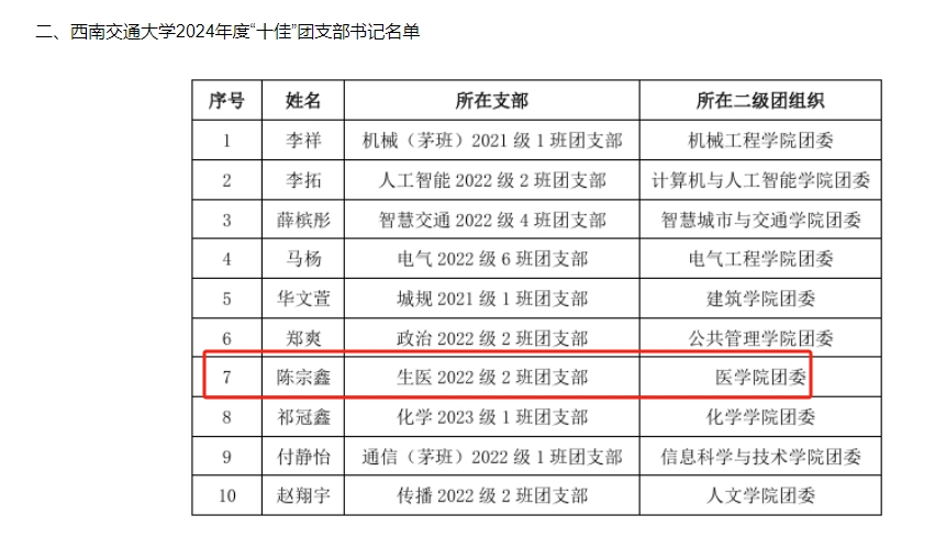 本科2022级学生陈宗鑫在本次“十佳”团支部书记评审中脱颖而出,成为学院首位获得此次殊荣的学生!