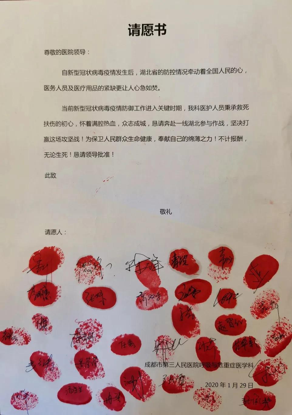 倡议一呼百应,无论是老党员、新党员,还是普通干部职工都纷纷响应,火速在请战书上留下了自己的名字。按照报名情况,将首批报名的18名医生、27名护士分为了三个小组,为支援储备力量。而后,来自呼吸与危重医学科的6医生、5名护士分别奔赴武汉、金堂,投身战疫第一线。