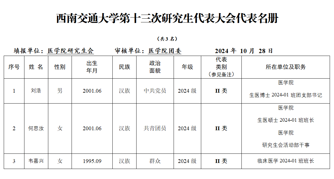 第十三次研究生代表大会筹备工作的预通知》,经班级(团支部)推荐,充分酝酿,共选举出研究生代表3名;经学院团组织提名,经班级(团支部)推荐,学院团组织考察,推选出研究生委员会委员候选人1名。现将代表选举结果、委员候选人推举结果公示如下,公示期2024年10月28日-10月31日,如有异议,请于2024年10月31日17:00前至色情直播