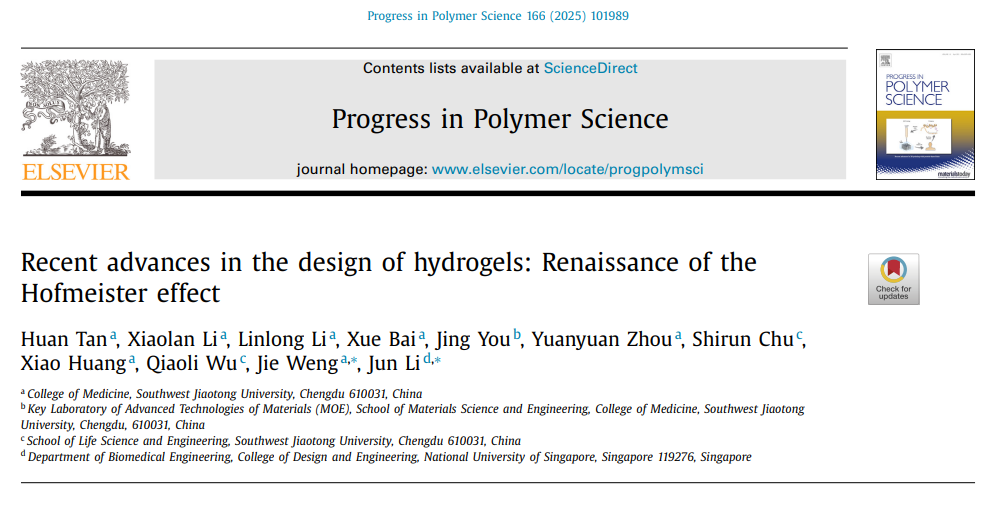 谭欢副教授在国际高水平期刊《Progress in Polymer Science》上发表了题为“Recent advances in the design of hydrogels: Renaissance of the Hofmeister effect”的综述论文,深入探讨了利用霍夫迈斯特效应调节水凝胶性能的最新进展。翁杰教授、新加坡国立大学李俊教授为共同通讯作者,色情直播
