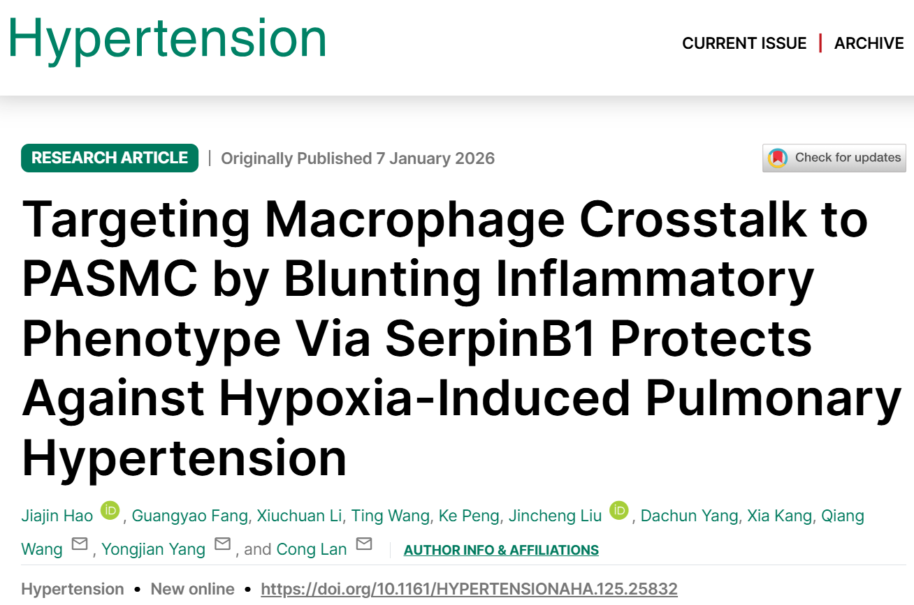 2023级在读硕士研究生郝佳瑾以第一作者在心血管领域权威期刊Hypertension(中科院1区TOP,影响因子8.2)发表了题为“Targeting macrophage crosstalk to PASMC by blunting inflammatory phenotype via SerpinB1 protects against hypoxia-induced pulmonary hypertension”的原创性论文。该研究首次揭示了巨噬细胞-肺动脉平滑肌细胞对话存在缺氧应答效应,并明确丝氨酸蛋白酶抑制剂B1(SerpinB1)下调是缺氧暴露诱导巨噬细胞炎症表型的关键机制,巨噬细胞SerpinB1过表达可有效阻断肺动脉周围巨噬细胞对肺动脉平滑肌细胞的“恶性对话”,减轻HPH。该研究为HPH的防治提供了新的理论支持和潜在治疗靶点。色情直播
