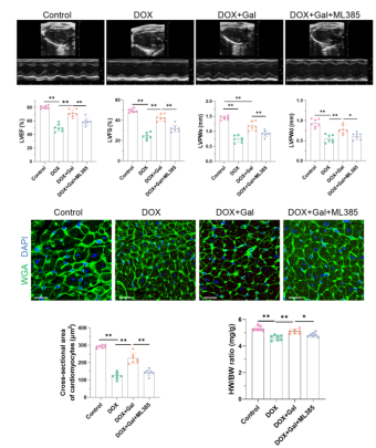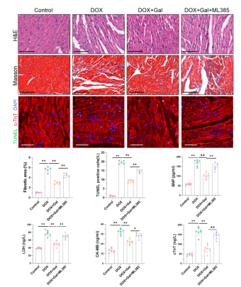 为进一步验证Gal通过激活Nrf2来发挥生物活性,Nrf2特异性抑制剂ML385被用来阻断Nrf2的作用。与预期的一样,ML385阻断了Gal抗氧化应激、抗炎的功能,继而阻断了Gal对心肌损伤和心功能的保护。