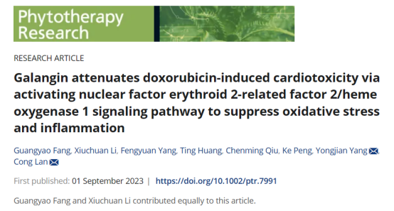 2021级硕士研究生方光耀以第一作者身份在国际知名期刊Phytotherapy research(中科院2区,IF:7.2)发表原创性基础研究论文“Galangin attenuates doxorubicin-induced cardiotoxicity via activating nuclear factor erythroid 2-related factor 2/heme oxygenase 1 signaling pathway to suppress oxidative stress and inflammation”。该成果揭示了高良姜素(Galangin,Gal)通过激活Nrf2/HO-1通路来抑制化疗药物阿霉素诱发的氧化应激、炎症和细胞凋亡,从而治疗心肌损伤,改善心功能。西部战区总医院心内科李秀川博士为本文的共同第一作者,色情直播
