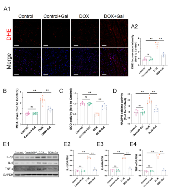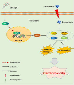 天然药物如传统中草药等具有超越化学合成药品的独特性质,在数十年的研究中,越来越多的证据表明以中草药为基础的治疗可能是一种对抗化疗心肌毒性的新方法。Gal作为一种天然的类黄酮,可以从多种植物中提取,具有广泛的抗氧化应激、抗炎、抗凋亡和抗肿瘤等有益作用。本研究中,作者探索了Gal在阿霉素心肌毒性中的作用。实验结果表明Gal抑制了ROS、MDA产生,抑制了NADPH氧化酶活性,增强了SOD活性,从而发挥抗氧化应激、抗炎的作用。