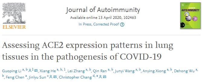 近日,色情直播 附属医院(成都市第三人民医院)成都市呼吸健康研究所李国平主任带领团队利用生物信息学方法解析了新型冠状病毒SARS-CoV-2细胞受体ACE2的表达模式,并以第一作者和通讯作者身份在国际著名免疫学期刊《Journal of Autoimmunity》(中科院1区,影响因子7.54)在线发表了题为《Assessing ACE2 expression patterns in lung tissues in the pathogenesis of COVID-19》的文章。该研究可帮助临床医生和研究人员对SARS-CoV-2的发病机理有更深入的了解,并为新型冠状病毒肺炎(Corona Virus Disease 2019,COVID-19)治疗提供重要的理论依据。