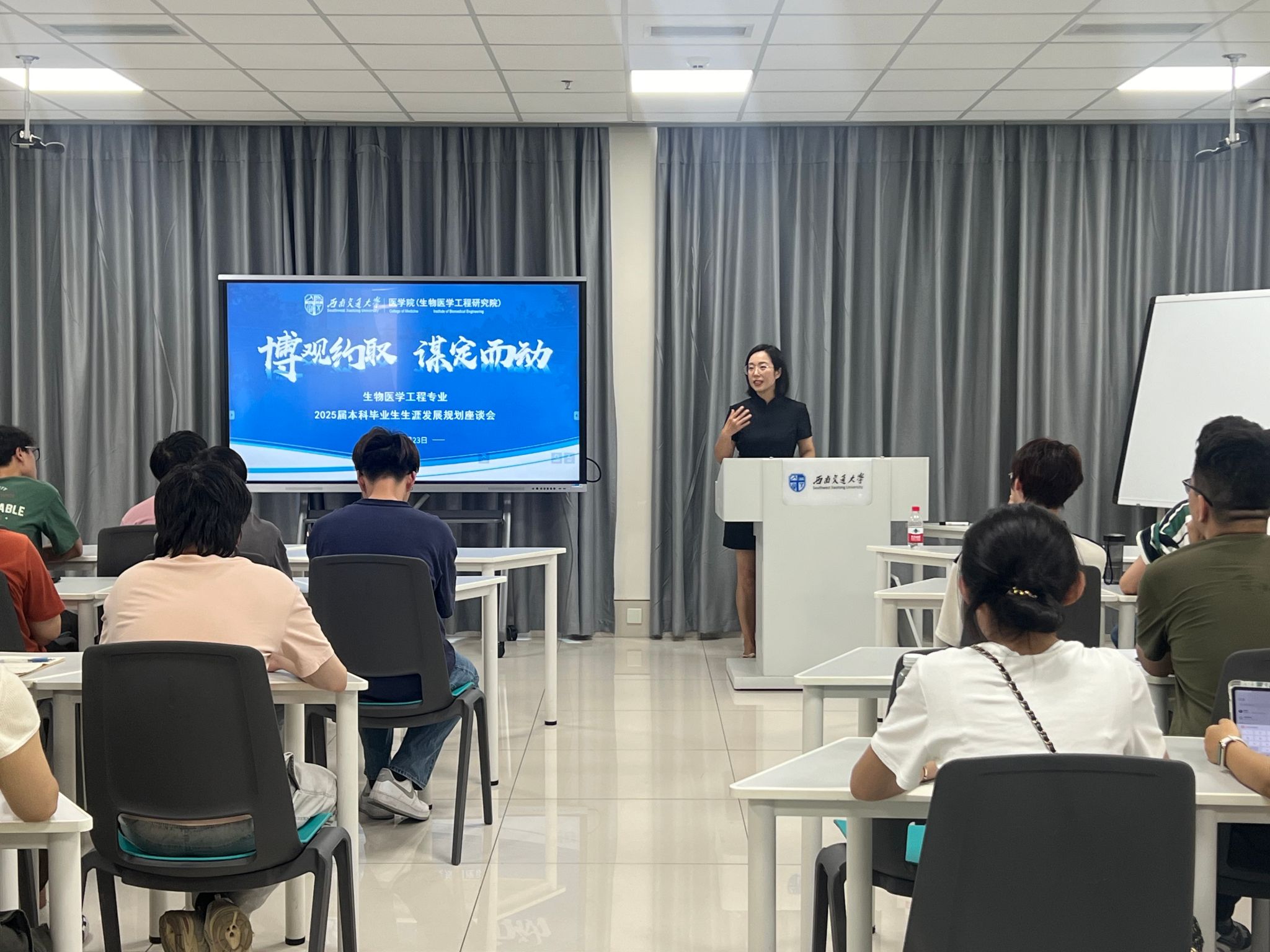 党委副书记于楠为同学们带来了生物医学工程专业近十年来的升学与就业情况分析。她通过详实的数据和案例,展示了生物医学工程专业毕业生在升学深造和就业市场上的优势和竞争力。于楠副书记还就当前就业市场的趋势和用人单位的需求进行了讲解,为同学们提供了宝贵的就业建议。