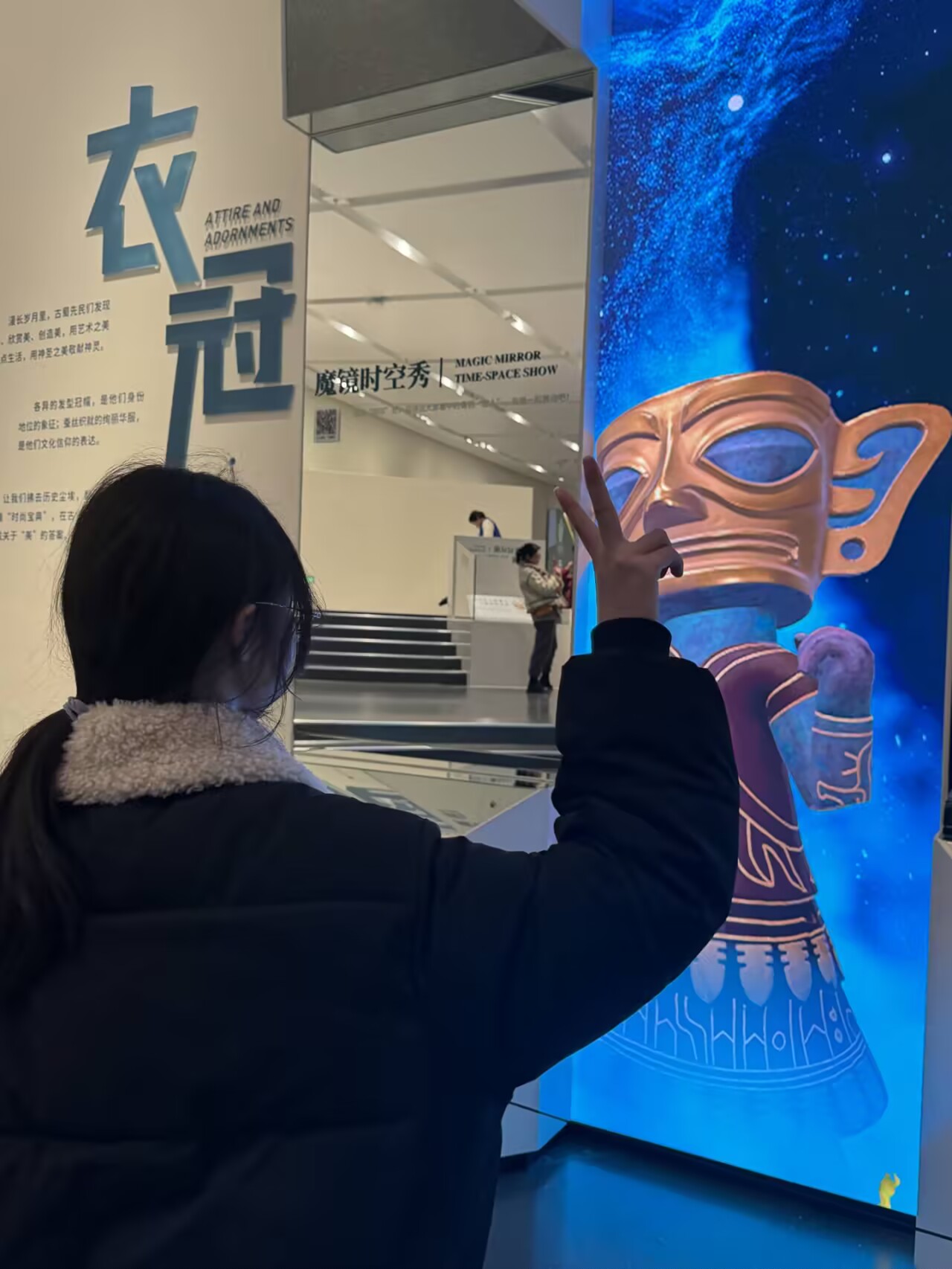 在博物馆的各个展馆内,队员们分散开来,沉浸于对⼀件件精美文物的观赏之中。青铜大立人像庄严肃穆,其高大的身形和独特的造型,仿佛在诉说着古蜀时期的神秘祭祀场景;青铜面具造型夸张,那巨大的眼睛和宽阔的嘴巴,让人不禁对古蜀先民丰富的想象力和卓越的青铜铸造工艺赞叹不已。还有那精美的玉器、陶器等,每一件文物都犹如一本无言的史书,记录着古蜀文明的发展脉络。