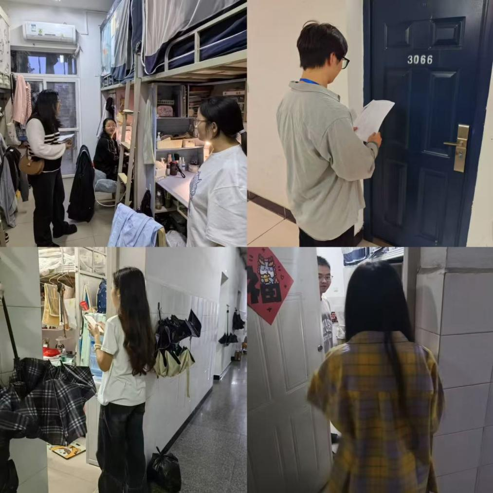 依托学生会、研究生会,成立10余人的安全联合检查小组,开展宿舍、实验室双线联合检查。围绕 “平安医学” 建设,分别深入犀浦校区、九里校区查隐患、筑防线,为全体在校学生营造安全环境并强化其安全意识。此次联合检查由院党委副书记于楠统筹部署,辅导员胡豪、靳涵、廖柯琳、韩鹏飞分别带队开展。