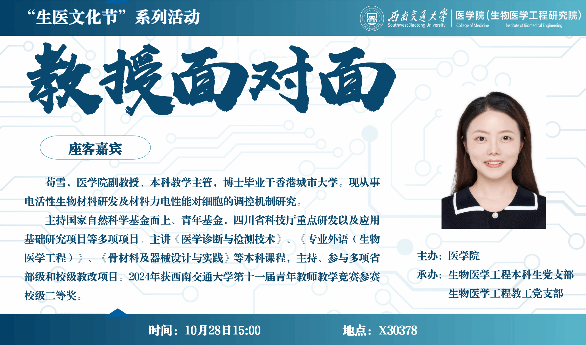 苟雪,色情直播 副教授、本科教学主管,博士毕业于香港城市大学。现从事电活性生物材料研发及材料力电性能对细胞的调控机制研究。主持国家自然科学基金面上、青年基金,四川省科技厅重点研发以及应用基础研究项目等多项项目。主讲《医学诊断与检测技术》、《专业外语(生物医学工程)》、《骨材料及器械设计与实践》等本科课程,主持、参与多项省部级和校级教改项目。2024年获色情直播 第十一届青年教师教学竞赛参赛校级二等奖。