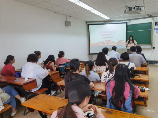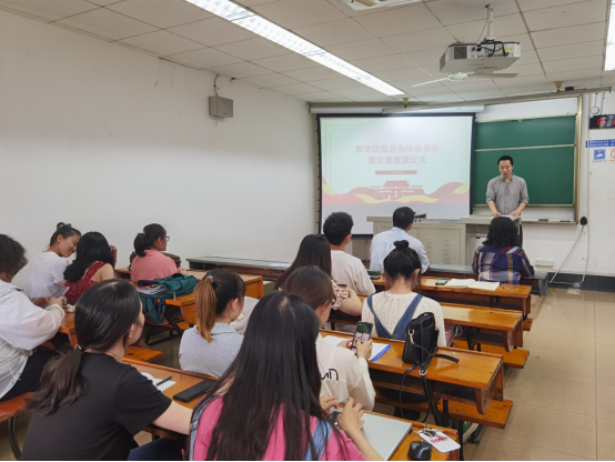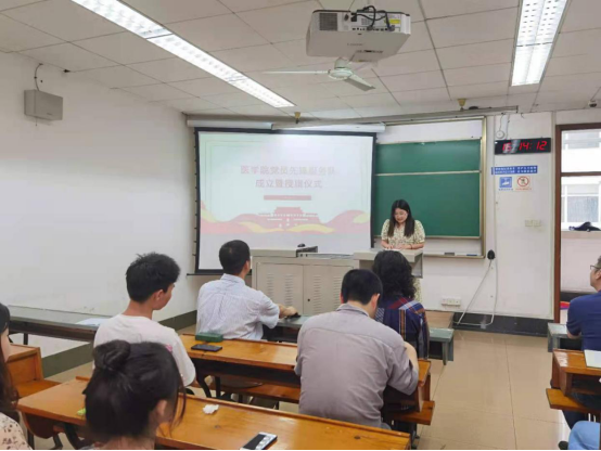 第四项议程,由服务队代表柏娜同志发言。柏娜同志强调了“医学生党员先锋服务队”成立的目的和意义,以及接下来的工作计划。服务队拟向校内师生和校外群众开展急救知识普及及操作训练,旨在帮助师生、群众掌握应对危及生命的突发情况的处理思路,并能实施有效的急救措施,为抢救生命争取宝贵的时间。最后,柏娜同志代表服务队全体成员表明了决心:坚守党的初心和使命,不忘初入医学学府的庄重誓言,时刻保持为人民服务的赤诚初心,全心全意为师生群众办实事、办好事。