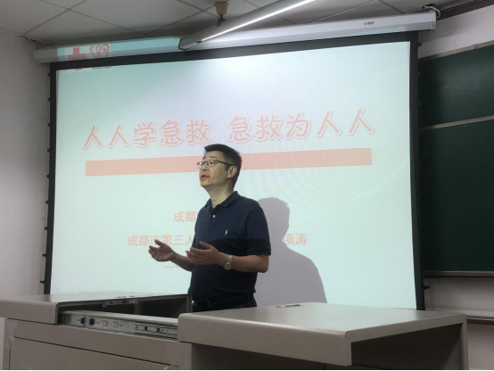 项涛主任主要讲解了现场救护流程及方式方法,从心肺复苏(呼吸道异物梗阻)、创伤救护(止血、包扎、骨折固定、伤员搬运)、意外伤害三部分进行了详细讲解。