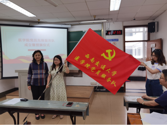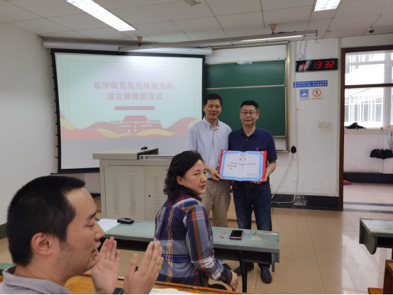第三项议程,由党总支书记李锦红同志为服务队指导教师项涛颁发聘书。