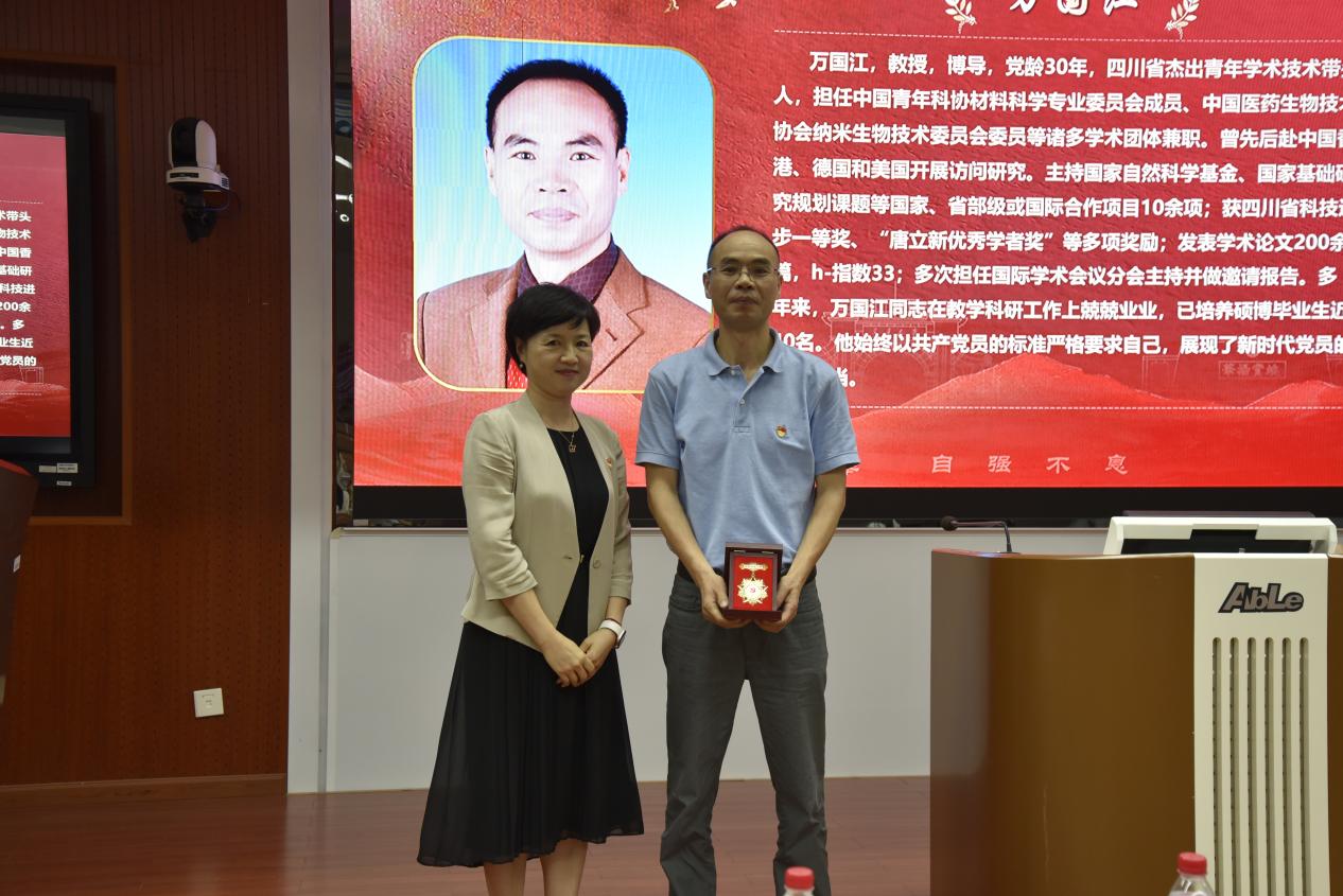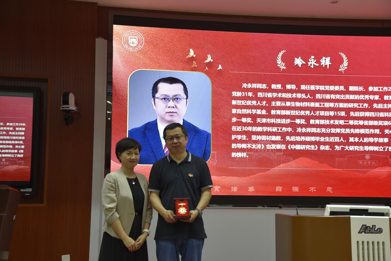党委特为党龄30年以上的冷永祥、万国江两位同志定制了“光荣在党30年”纪念章,以表达对两位同志在学校、学院发展以及党和国家教育、科研事业中所作贡献的衷心感谢和崇高敬意。党委书记曾东红为两位同志颁发了纪念章。