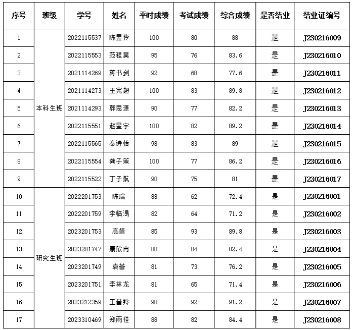 结业标准:平时成绩占40%,考试成绩占60%,综合成绩达到60分视为结业