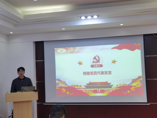 议程第三项,预备党员代表巩瀚文同志发言,他讲到,加入党组织,仅仅是一个共产党人万里长征的第一步,要想成为一名斗志昂扬、信念坚定的共产主义战士实属不易,组织上入党只是一时的事,思想上则需要用一生的时间去靠拢,前路漫漫亦灿烂,我们仍需更多的磨练和不懈的努力。同时,他代表全体预备党员向党组织做出了庄严承诺:一是将不断提升思想政治修养,加强党性锻炼,履行党章要求,始终保持解放思想,与时俱进的精神状态,在实践中积极探索,不断加深对党的路线、方针、政策的认识和理解;二是将树立终身学习的观念,努力增强学术能力,不断开拓专业视野,积极阅读文献、开展实验工作,争取在科研方面有所突破;三是将本着全心全意为人民服务的根本宗旨,充分发挥党员的先锋模范作用,促进学校、学院各项工作的开展。